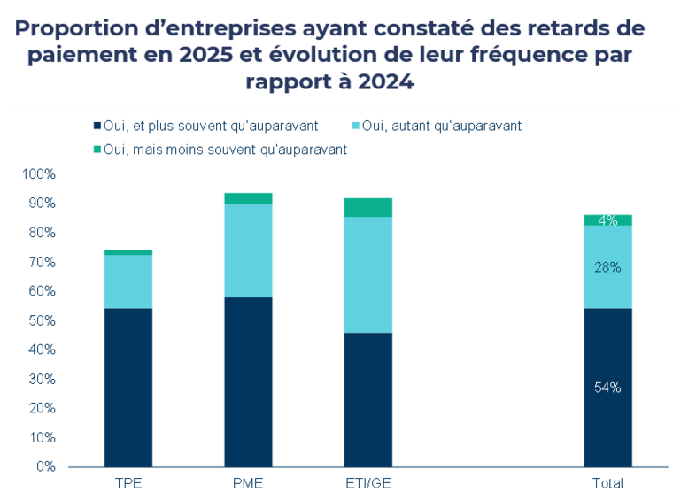 86% des entreprises françaises déclarent avoir été confrontées à des retards au cours des 12 derniers mois (contre 82% en 2023 et 85% en 2024). Ce phénomène touche tous les secteurs, avec une proportion particulièrement élevée pour les très petites entreprises : plus de la moitié d’entre elles jugent désormais l’impact « critique » sur leur trésorerie.