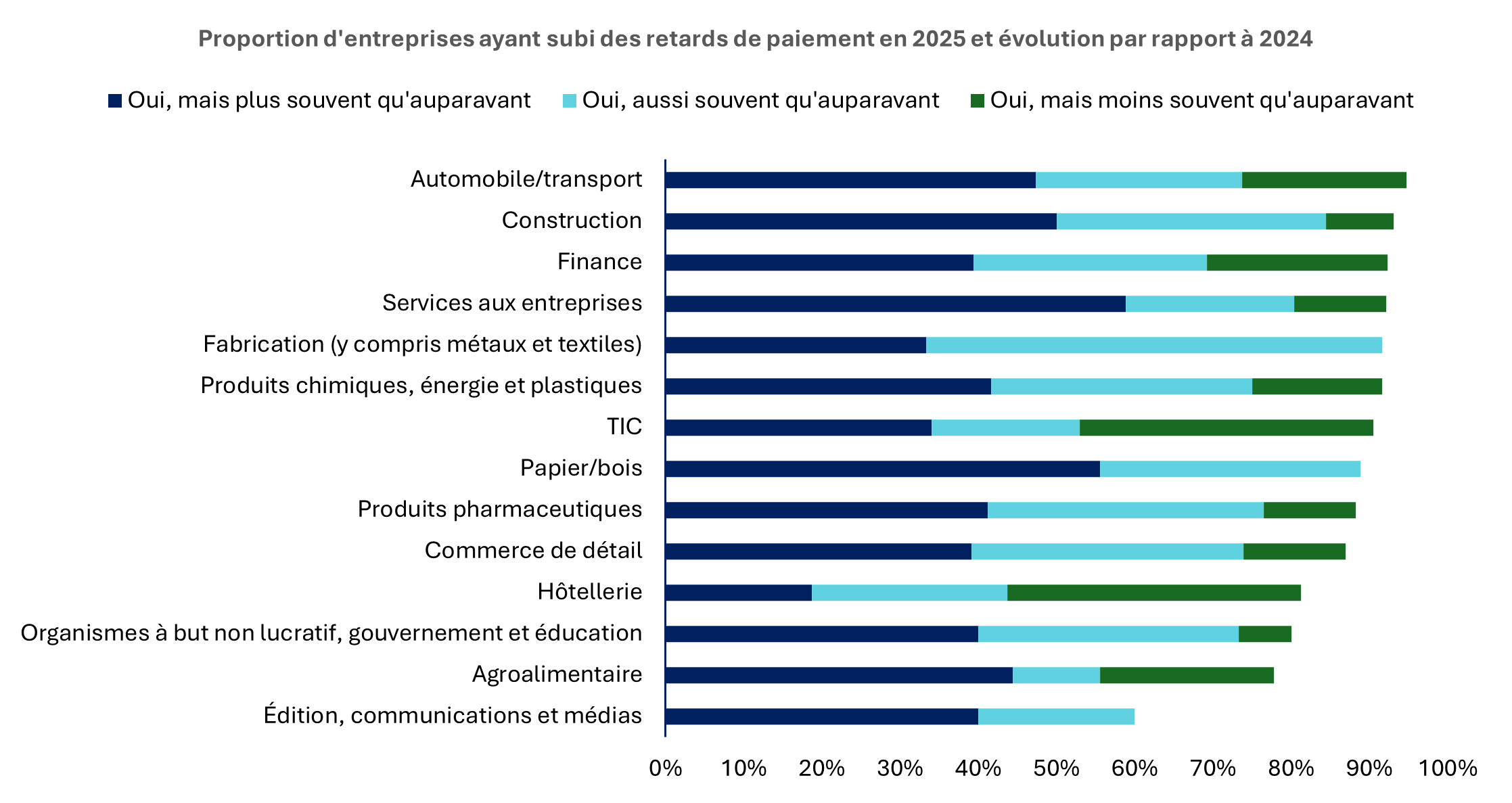 L’étude met en évidence des disparités importantes entre les secteurs. La construction et l'automobile/transport sont les plus touchés par l'augmentation des retards de paiement (respectivement 95% et 93%), tandis que l'édition, les communications et les médias (60%), l'agroalimentaire (78%) et les organisations à but non lucratif, les administrations publiques et l'éducation (78%) signalent moins de problèmes. Cela s'explique souvent par des délais de paiement plus longs dès le départ ou une discipline plus stricte des acheteurs.