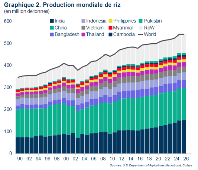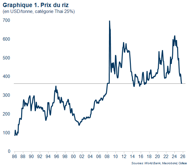 Depuis 2022, l’Inde, premier exportateur mondial, avait restreint ses ventes à l’export pour contenir l’envolée des cours mondiaux (hausse des prix de 19% en 2022 et 2023) liée notamment à la guerre en Ukraine et de mauvaises conditions météorologiques en Asie. La réouverture des exportations en 2024, couplée à des récoltes asiatiques record, a entraîné une chute de 35 % des prix en un an. Compte tenu des prévisions de production à la hausse pour 2026 et du retour potentiel de La Niña au quatrième trimestre 2025, nous anticipons un excédent croissant de l'offre en 2026. Les prix devraient continuer à baisser au moins jusqu'à la fin de 2025, avec une stabilisation probable en 2026 à des niveaux bas inégalés depuis 10 ans.